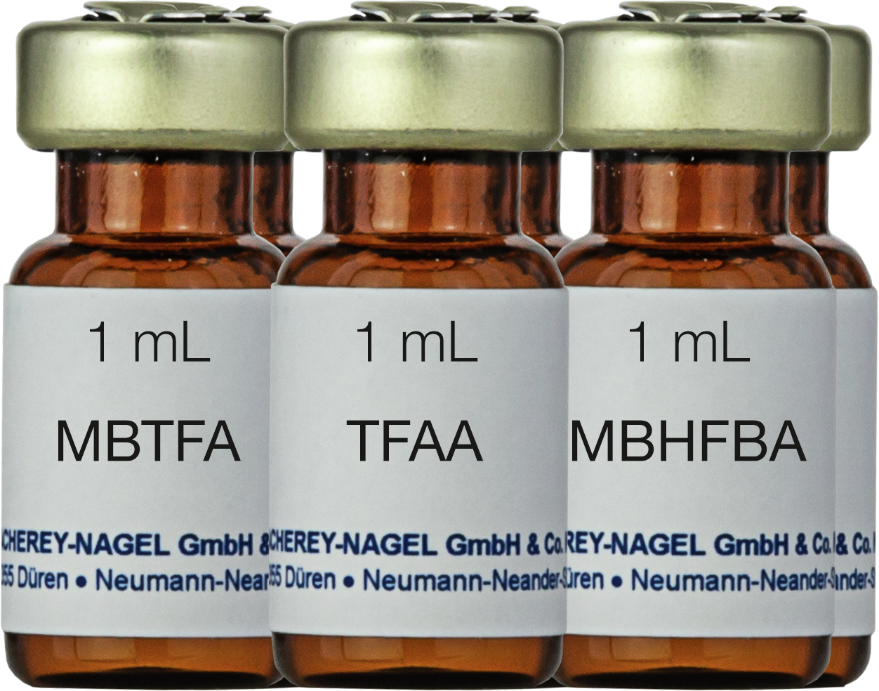 Verschiedene Derivatisierungsmittel in einem Kit zur Entwicklung einer geeigneten Derivatisierungsmethode (Acylierung). Diese Produkte enthalten kennzeichnungspflichtige Gefahrstoffe. Für detaillierte Informationen bitte das Sicherheitsdatenblatt beachten.