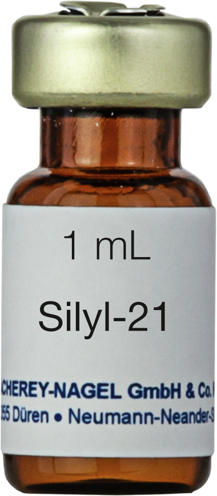 Diese Mischung von Silylierungsmitteln SILYL-21 besteht aus HMDS – TMCS (2 -1), das fertig zur bequemen Anwendung ist. Zur Trimethylsilylierung von organischen Verbindungen, aprotischen Lösemitteln wie Acetonitril, Pyridin, Dimethylformamid, Schwefelkohlenstoff und Dimethylacetamid. Diese Produkte enthalten kennzeichnungspflichtige Gefahrstoffe. Für detaillierte Informationen bitte das Sicherheitsdatenblatt beachten.