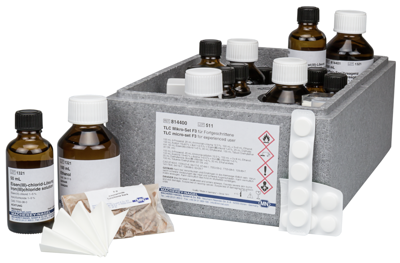 Das TLC Micro-Set F3 ist das Fortgeschrittenenset 3 für den naturwissenschaftlichen Unterricht. Es enthält alle Chemikalien, die für die – Trennung von Analgetika (Schmerzmittel) und Drogenanalyse am Beispiel der Chinarinde erforderlich sind. Für die Trennung mit Micro-Set F3 sind die Materialien von TLC Micro-Set M Voraussetzung. Dieses Produkt enthält kennzeichnungspflichtige Gefahrstoffe. Für detaillierte Informationen bitte das Sicherheitsdatenblatt beachten.