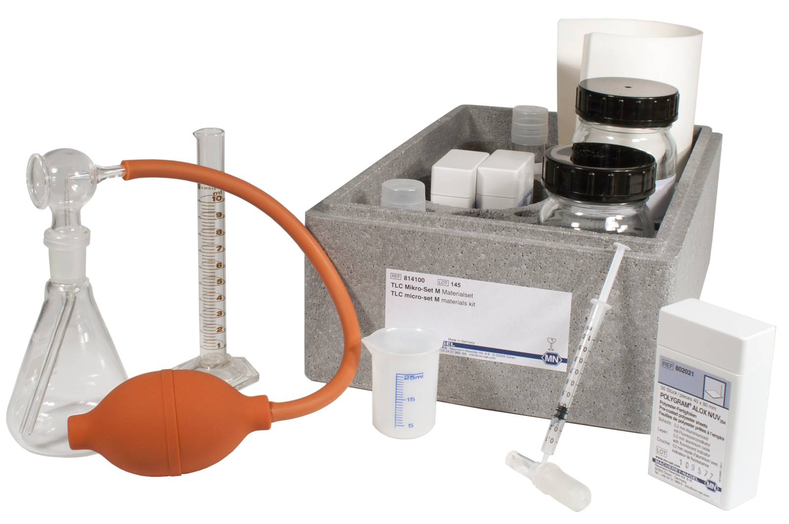 TLC Micro-Set M ist das Materialset und besteht aus: 2x Entwicklungskammern, 2x 50 Glaskapillaren 1 µL, 1x Gummihüttchen für Glaskapillaren, 2x Auftragschablonen, 1x Messzylinder 10 mL, 1x Becherglas 25 mL, 1x Laborsprüher aus Glas mit Gummiball, 1x Plastikspritze 1 mL, 20x Bogen Filterpapier MN 713 (15 x 21 cm), je 50x Polyesterfolien aus POLYGRAM, 4 x 8 cm – SIL G/UV254, Alox N/UV254 und CEL 300.