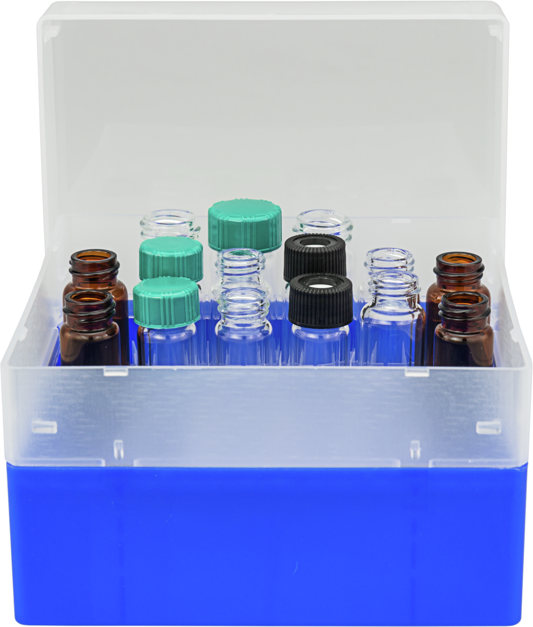 Numune şişelerinin güvenli bir şekilde taşınmasını sağlar. Dişli şişeler N 15 için bölme ekinde güvenli stand (örnek saklama: 702096, 702311, 70285, 702097). Şeffaf kapak, kapaklarda yoğuşmayı ve dolayısıyla buzdolabında olası kirlenmeyi önlediğinden buzdolaplarında yer tasarrufu sağlayan saklama için idealdir. Flakon kapları dondurucular için uygundur ve -100° C ila 121° C arasında sıcaklığa dayanıklıdır.